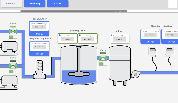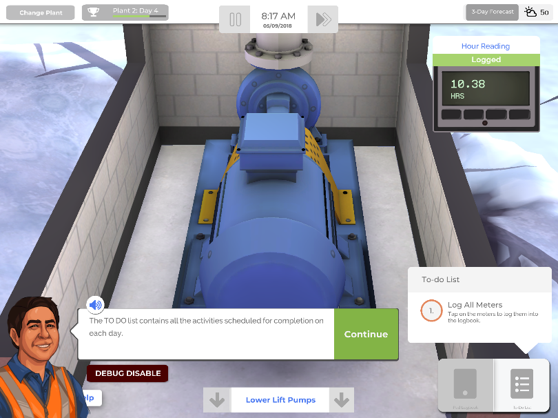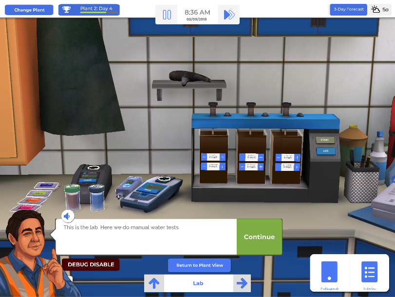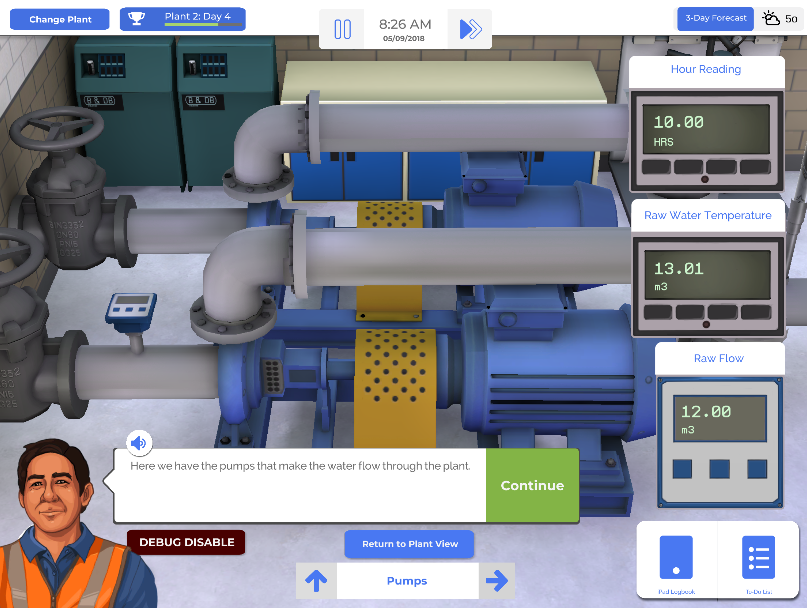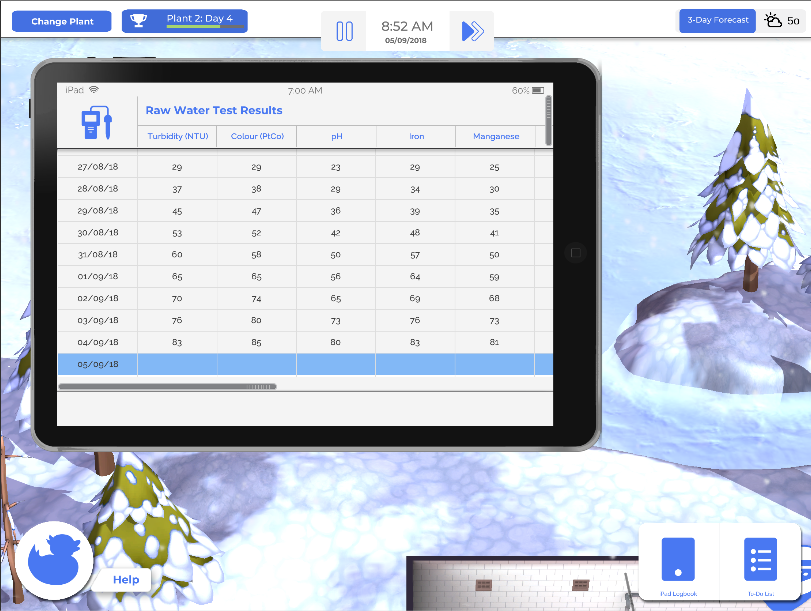 Starting from the ground up, I have designed and developed a fully functional water treatment simulator in Unity. The premise is to teach students in Northern Ontario how to treat water the correct way, and the delicate balance that is clean water. This app includes several systems, including time, a tutorial system, a SCADA system which applies dosages of disinfectants and coagulants to clean water. The user is able to look at trending graphs of previous days, logbooks of previous logged meters, test water samples in the lab, and use all the knowledge to maintain the water system.